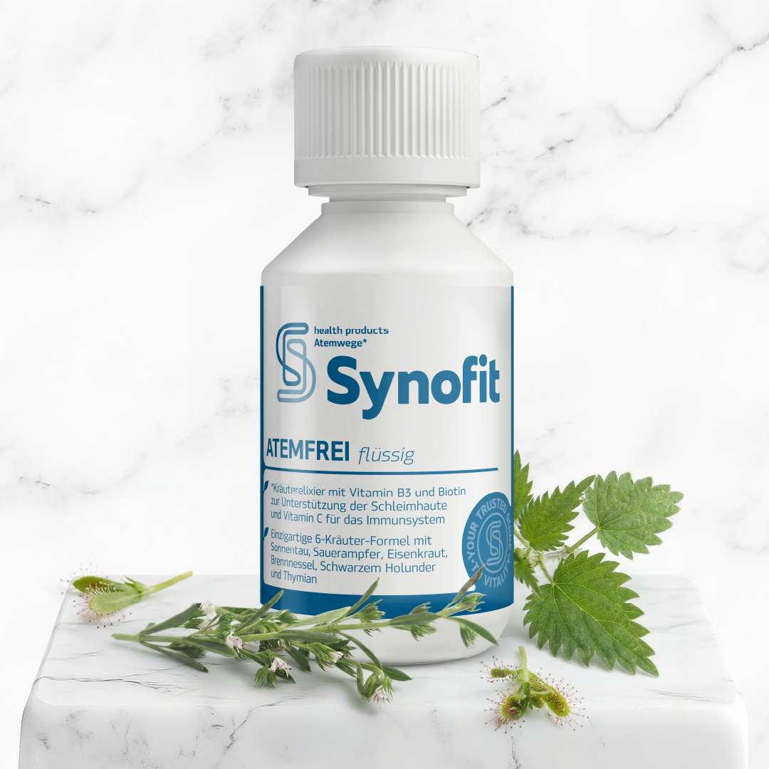 Synofit Atemfrei ist ein pflanzliches Produkt mit sechs verschiedenen Pflanzenextrakten. Sonnentau ist ein wichtiger Inhaltsstoff mit Wirkung auf die Atemwege¹ für freies Durchatmen¹. Darüber hinaus wurden Extrakte aus Sauerampfer, Holunderblüten, Eisenkraut, Brennnessel und Thymian in dieses einzigartige Getränk eingearbeitet. Neben den Pflanzenextrakten enthält Synofit Atemfrei auch die Vitamine B3, B8 und C. Vitamin B3 und Vitamin B8 unterstützen die normale Funktion der Schleimhäute. Vitamin C unterstützt das Immunsystem.