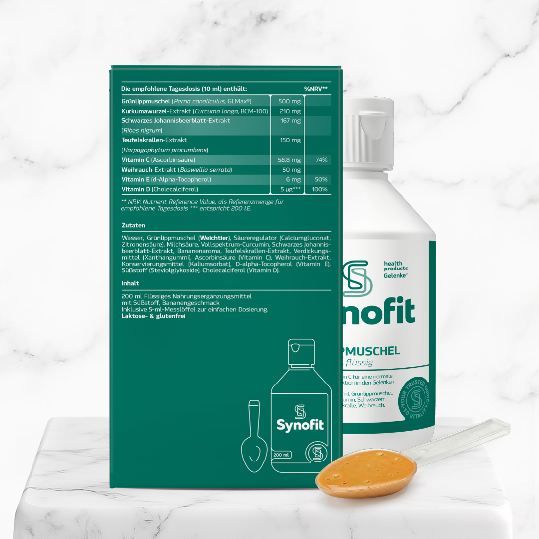 Synofit Grünlippmuschel Flüssig mit Kurkuma für die Gelenke1. Maximale Unterstützung bei Ihren täglichen Aktivitäten. Extra Aufmerksamkeit für Ihre Gelenke1.
